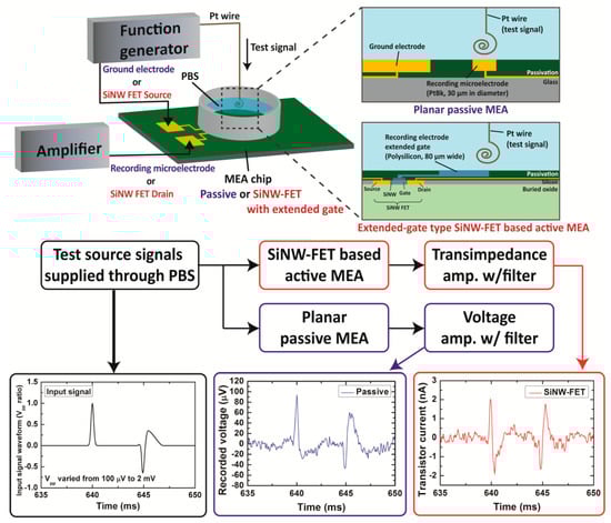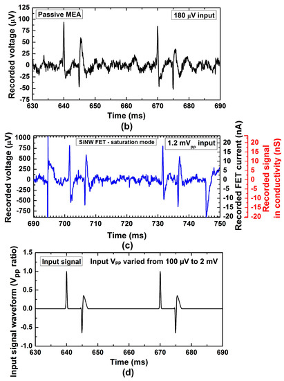 For the controlled test input signal, a series of Gaussian and extracellular neural spike signals were generated by a low noise function generator, Keysight 33500B (Keysight Technologies, Inc., Santa Rosa, CA, USA) as shown in Figure 1. The pulse duration was 3 ms. The extracellular spike waveform was reproduced from the actual extracellular neuronal spike recorded from cultured hippocampal neurons. The generated artificial neuron signal with varying amplitude with respect to the reference voltage (from hundreds of µV to a few mV) was supplied through a platinum wire. The Pt wire was submerged in 1× phosphate buffered saline (PBS) (purchased from Gibco™, Waltham, MA, USA), and the wire was placed as close to the recording electrodes as possible. As the recording reference electrode, we chose either an additional large gold electrode on the chip for the passive MEA, and the source terminals of the SiNW FETs or a large Pt wire dipped in PBS for the SiNW FET active MEA. Though the source electrodes of the FETs were passivated from the PBS, the highly insulating SU-8 passivation layer holds the entire input signal intensity between the potential near the recording electrode and the reference electrode, allowing precise and robust control of the recorded input signal voltage near the FETs.