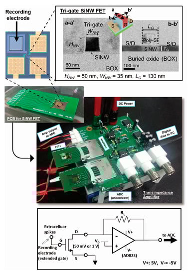 Silicon nanowire field-effect transistor and the transimpedance amplifier for the field-effect transistor FETs: Cross-sectional TEM image of the silicone nanowire (SiNW) FETs (top right); Top view of a SiNW FET and 80-µm extended recording electrode (top left); printed circuit board (PCB) for the SiNW FET wafer and the amplifier system (middle); circuit configuration for the transimpedance amplifier (bottom).