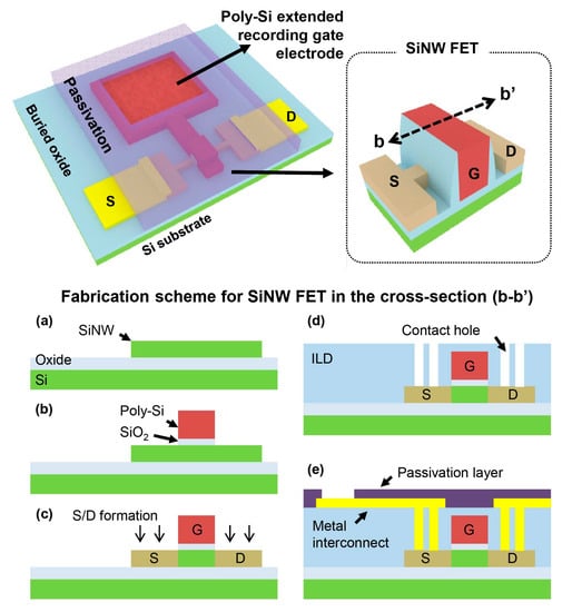 For the back-end process, SiO2, Cr/Au and SU-8 layer was used for an inter-layer dielectric (ILD), interconnects and a passivation layer, respectively. By LPCVD process, 200-nm thick SiO2 for ILD was deposited, and then contact hole patterning and etching was followed. Afterward, forming gas annealing was carried out with ambient condition of 10% H2, and 90% N2 ambient at 400 °C for 30 min to reduce non-desired traps in SiNW FETs. Cr (10 nm)/Au (200 nm) for interconnects were sequentially deposited by an evaporator, and Cr/Au layer were patterned by a lift-off process. The recording electrode (80-μm rectangular shape) was exposed by etching the oxide layer on the extended poly-Si gate with 10:1 diluted HF. Finally, all devices except recording electrode were passivated by 2-μm thick SU-8 layer. Overall fabrication process flow is provided in Figure 3.