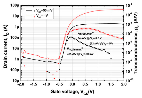 Transfer characteristic of the SiNW FETs are shown in Figure 4 Transconductance (gm), defined as the derivative of drain current with respect to gate voltage (ids/vgs), is calculated from the ID-VGS. The transistors are depletion mode maximizing the gm at zero electrolyte dc bias (i.e., VGS = 0 V) while minimizing risk of electrochemical corrosion and damage [16]. The maximum gm of a representative transistor is 4.2 µA/V in linear mode (VDS = 50 mV, VGS = 50 mV), and 34 µA/V in saturation mode (VDS = 1 V, VGS = 0.5 V), respectively. Other important device parameters are summarized in Table 1.