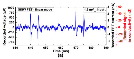 Figure 5 shows representative recorded signals by both passive and active MEAs. Both MEAs showed nearly the same waveform as the input voltage signal. It indicates that there is no or negligible capacitive effect at both electrode–electrolyte interfaces due to double layer capacitance. The amplitude of recorded signals by SiNW FET was similar to what was theoretically estimated by the common source amplifier gain, gm. Depending on the operation mode of the transistors (i.e., either linear or saturation mode), the output current for 1.2-mV spike signals is 3.28 ± 0.09 nA in linear mode and 26.16 ± 0.52 nA in saturation mode operation. It refers to the output current/input voltage values of 2.74 ± 0.07 µA/V and 21.8 ± 0.43 µA/V, respectively, which are close to the extracted gm of 3.9 µA/V and 21.6 µA/V at zero gate bias in Figure 4. It is, therefore, theoretically possible to achieve nA-scale signal even from 100-µV spike signals (e.g., 100 µV × 21.6 µA/V results in 2.16 nA).