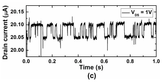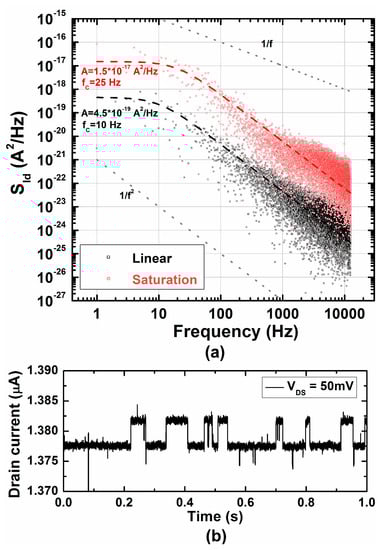 where A is constant in A2/Hz as specified in Figure 6a. This behavior is often observed in nanoscale transistors and known as random telegraph noise (RTN) due to its transient response which resembles a telegraph signal. In Figure 6b,c, the time domain characteristics of RTN corresponding to the spectra in Figure 6a are shown. The fc in saturation was slightly higher than in linear, showing more frequent telegraph signal change. The RMS noise was 2.32 nA before band-pass filter and 476 pA after filtering.