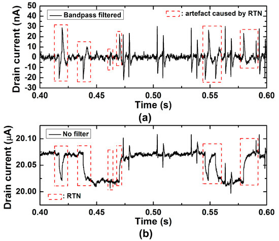 For further SNR improvement, 1/f noise needs to be reduced, and geometric optimization of the FETs will be able to enhance the SNR based on the 1/f noise model discussed in this work. In addition to the typical 1/f noise, RTN was observed in some of our SiNW FETs. It was observed that the RTN often observed in nanoscale transistors causes artefacts which could look like slow extracellular spikes and make spike sorting inaccurate. Designing wider FETs would alleviate both issues by reducing relative 1/f noise and chance of RTN. We should also consider developing a post-processing algorithm to filter out the artefacts possibly by comparing both filtered and unfiltered data. While the spike signals are unchanged after bandpass filtering, the artefacts caused by RTN before and after bandpass filter is clearly different. In addition, the artefact waveform often varies more slowly than typical extracellular spikes (three milliseconds).