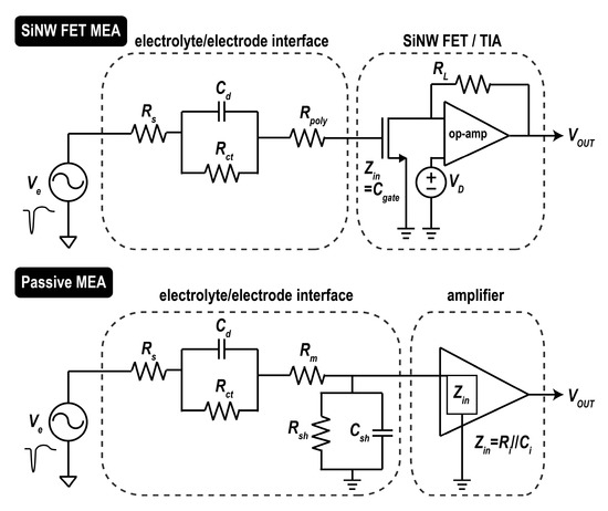 Equivalent circuits of overall MEA systems are drawn in Figure 8. The source voltage signal is connected to high input impedance amplifiers: for the active MEA, the gate terminal of SiNW FETs; and for the passive MEA, an input terminal of operational amplifier, AD823. In between, the resistance of the buffer solution, electrode-electrolyte double layer capacitor interface and resistance of recording electrodes (poly-Si, gold wire, respectively) are connected in series. The amplitude of the recorded signal is the small signal voltage at the input node of both MEAs. Depending on the values of the components in the circuit, the recorded voltage may experience voltage division from the source voltage (Ve). Therefore, higher input impedance of the amplifiers minimizes the signal loss. The input impedance of the SiNW FET is dominated by the small gate capacitance. For the thickness of oxide (tox) of 5 nm, 130 nm × 50 nm device area (L × W) leads to only 45 aF. Assuming the gate dielectric has good insulation quality, the input impedance of the active MEA would be even higher than 1 TΩ at 2 kHz. On the other hand, the input impedance of op amp in non-inverting amplifier configuration is roughly composed of an input capacitor (Ci) and an input resistor (Ri) in parallel. For AD823 which is a JFET-input-based op amp, the input impedance is 10 TΩ//1.8 pF, and it is 44 MΩ at 2 kHz. Although experimental confirmation is needed, it could be expected that the SiNW FETs with higher input impedance would record actual cellular signals through the electrolyte–electrode interface more efficiently than the passive MEA when Rs in Figure 8 is increased significantly due to any biological reason (i.e., highly resistive path is formed between the cell and the electrode). For example, the glial scar formation—which is the most common implant failure—around the MEA recording electrodes after implantation could increase the Rs.