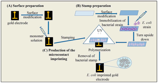 Schematic representation of microcontact imprinting of E. coli onto the polymer modified surfaces. (A) preparation of electrode surface; (B) preparation of bacteria stamps; (C) production of the microcontact imprinting (reproduced from [60] with permission).