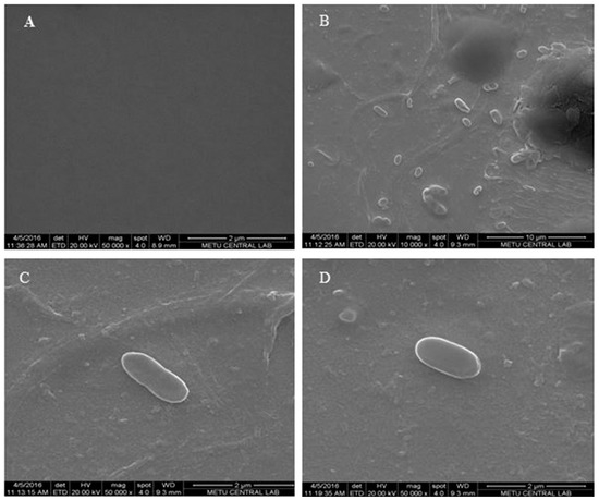 SEM images of bare gold electrode (A) −50,000×, and E. coli imprinted electrode (B) −10,000×, (C,D) −50,000× magnifications (reproduced from [60] with permission).