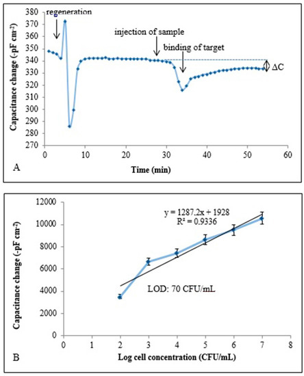 (A) Capacitive sensorgram of the E. coli imprinted electrode (concentration of E. coli: 1.0 × 107 CFU/mL), ΔC: change in capacitance; (B) calibration curve of E. coli obtained at a concentration range of (1.0 × 102–1.0 × 107 CFU/mL) under optimum conditions, LOD: limit of detection, flow rate: 100 μL/min; sample volume: 500 μL; running buffer: 10 mM sodium phosphate, pH: 7.4; regeneration buffer: pure ethyl alcohol, 10 mg/mL lysozyme solution (in 10 mM Tris-HCl buffer, pH 8.0, with 1 mM EDTA) and 50 mM glycine-HCl, pH 2.5; T 25 °C. (Reproduced from [60] with permission).