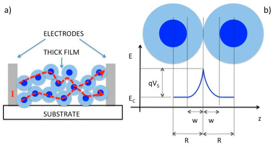Schematic representation of the structure (a) and working principle (b) of thick film gas sensors. Reprint from [7].