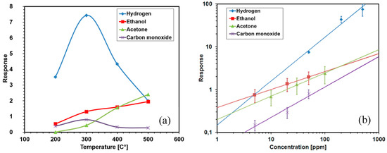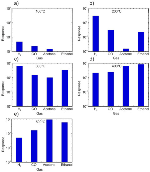 Response towards 500 ppm of H2, 500 ppm of CO, 50 ppm of acetone and 50 ppm of ethanol at the operating temperature of 100 °C (a), 200 °C (b), 300 °C (c), 400 °C (d), 500 °C (e), with 40% RH at the environmental temperature of 20 °C. Reprint from [32]. Response is calculated as the non-dimensional (Ggas – Gair)/Gair where Ggas and Gair are the steady state values measured in the presence of the target gas (H2, CO, acetone, ethanol) and in the background air respectively.