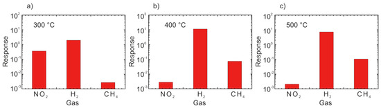 Response towards nitrogen dioxide, hydrogen and methane at 1 ppm, 1000 ppm, 50 ppm respectively and working the temperature of 300 °C (a), 400 °C (b), 500 °C (c) and RH 40% at the environmental temperature of 20 °C. Reprint from [38], copyright (2015), with permission from Elsevier.