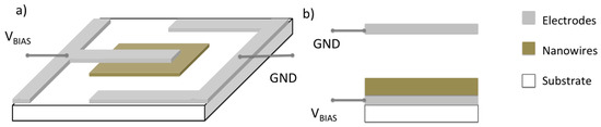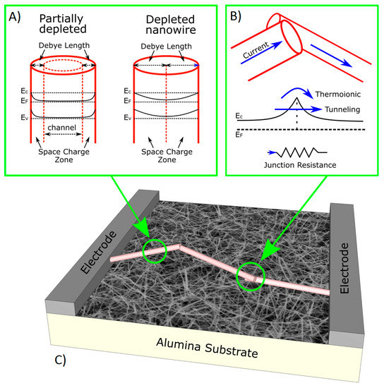 In most conductometric sensing devices, however, a mat of nanowires instead of a single nanowire forms the sensing layer (Figure 4c). In these devices, nanowires are connected forming a dense network, and the junctions between nanowires play a strong role in the sensing mechanism. Due to the presence of a space charge zone on the surface, the junction could be modeled as Schottky barrier [51], in which thermionic emission and tunneling effects control the electrical current (Figure 4b). Reducing the nanowire diameter there is an increase of the space charge zones on the surface, and the Schottky barrier decreases. In mat-based devices, these junctions could be seen as resistors, and are more sensitive to the interaction with the surrounding atmosphere than the nanowire itself [51].