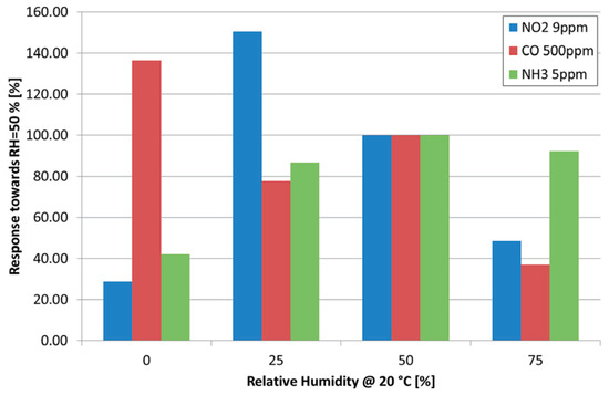 Influence of humidity on the 180 nm WO3 device response to nitrogen dioxide, carbon monoxide and ammonia. The y-axis reports the ratio between the response at the target value of relative humidity with respect to the reference value of RH = 50% at the environmental temperature of 20 °C. Sensor temperature is 200 °C. Reprinted from [56]—Reproduced by permission from The Royal Society of Chemistry.