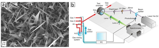 To perform optical characterization in presence of gas species, we have realized a macro-PL setup shown Figure 9b. The test chamber is made of stainless steel and equipped by quartz window. The sample works at room temperature or can be heated up to 400 °C (if needed). The synthetic air flux in the test chamber is maintained constant to 0.3 L·min−1, at 20 °C and atmospheric pressure, and mixed with the desired amount of gaseous target molecules. Photoluminescence (PL) measurements were carried out with a He–Cd excitation laser source (325 nm). PL spectra were acquired perpendicular to the sample surface using a single spectrograph and a Peltier cooled CCD camera.