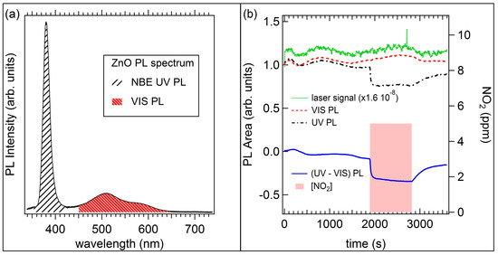 In our previous work [77], we observed NO2 detection properties that were independent of the emission band selected for detection. The difference in sample preparation and morphology of ZnO samples analyzed here could be responsible of the modified behavior of PL signal, but careful investigation is in process. It is indeed of high relevance to have a signal linked only to NBE emission of ZnO which is much less dependent on the sample preparation conditions than defect band is.