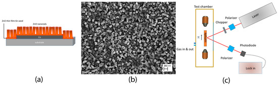 (a) Sketch of the sensing device; (b) SEM image of ZnO NRs surface; (c) Scheme of MOKE readout for gas sensing application.
