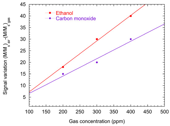 The sensing measurements were acquired by measuring the changes in magnetization of the Co/ZnO hybrid with an in-plane magnetic field of 50 Oe. The changes in magnetization are induced by gas interaction. The gas carrier was dry synthetic air, and after a stabilization period H2 (200-300-400 ppm) and CO (200-300-400 ppm) were introduced. The interaction with reducing gases reactions induce a decrease in the magnetization proportional to the target gas concentration. The baseline signal is completely recovered after dry air restoration, with quite fast response and recovery times (both less than 60 s) [89]. The results are resumed in Figure 12: we plotted the sensor response R, defined as R = (Mair − Mgas)/Mair, where Mair (Mgas) is the measured magnetization in air (gas) with the applied in-plane magnetic field (M) of 50 Oe. We can observe that response is linearly proportional to gas concentration, while in case of electrical gas sensing the dependence of relative response to the concentration is described by a power law [92]. To exclude that the observed sensing properties are due to changes in the reflectivity or in the optical properties of ZnO NRs, experiments at zero magnetic field were carried out, showing no magnetization variation upon gas interaction.