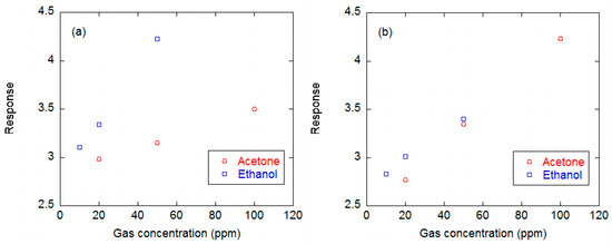 Other worth to note important differences are the lower temperature and voltage that can be used to promote surface ionization phenomena in the planar configuration. Indeed, the planar configuration can be activated already at temperatures around 350 °C and voltages of 30 V (corresponding to an electric field around 1500 V/cm), while 600–800 °C and 104 V/cm are necessary with the vertical layout [71]. An example of the response exhibited by a surface ionization device based on a CuO nanowire layer and planar configuration to acetone and ethanol is reported in Figure 8. These sensing measurements show a behavior coherent with the ionization energy argument (9.70 eV for acetone, 10.48 for ethanol [74]).