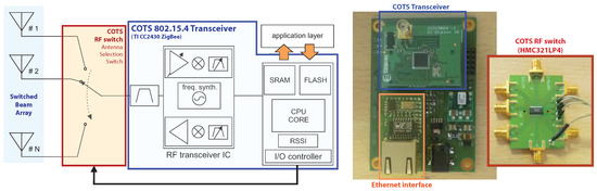 Each anchor node is built on the concept of a switched-beam array [16,20,21]. In Figure 2, a brief hardware description is shown, including both the antenna array structure and the anchor node block diagram; functionally, the concept is to place a uC-controlled RF switch on a standard ZigBee transceiver (i.e., in [19], a COTS Texas Instruments CC2430 transceiver was used), which connects the RF channel to every antenna of the array.