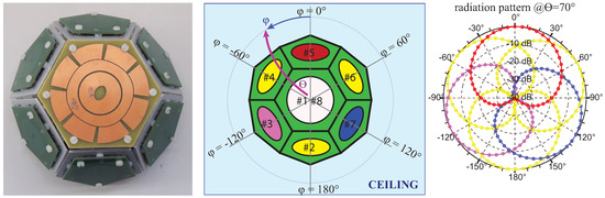 The antennas are implemented as printed patch antennas, radiating a characteristic and regular far-field pattern (Figure 3, [22,23,24]). The antennas operate in circular polarization, permitting a reliable link regardless of the relative orientation of the tag [19,25,26]. Furthermore, circular polarization is a strong aid in contrasting multipath impairment [27,28,29]. A set of patterns is projected over different spatial areas [19] and for each anchor tag data packet a complete RSSI vector for each antenna, called the steering vector, is given.