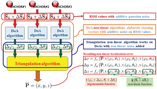 The error propagation scheme is conceptually depicted in Figure 4 and Figure 5. Note that while the typical triangulation approach in fact gets the different DoA estimations from each anchor node without performing any kind of reciprocity check, dealing with overall RSSI information (thus processing a “global steering vector” given by the entire network of anchors) a single conceptual block can access to the entire information batch allowing to implement smarter localization algorithms.
