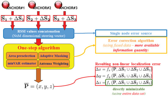 The proposed approach analyses the RSSI values collected from the overall anchor-node antennas. Dealing with an highly spread antenna distribution, an extensive information about environment is given reducing the needing of information fusion with additional sensor data; the needing of an off-line calibration phase is removed thanks to predictability increase overall the observation area. Additional information given by a “global steering vector” can be exploited through different processing blocks (accurately described in Section 3) lying within the “One-Step” localization algorithm (Figure 5) which are able to feed each other to refine final estimation results.