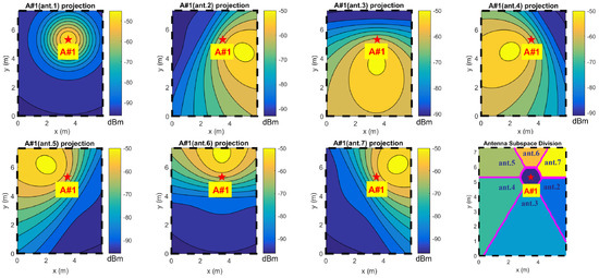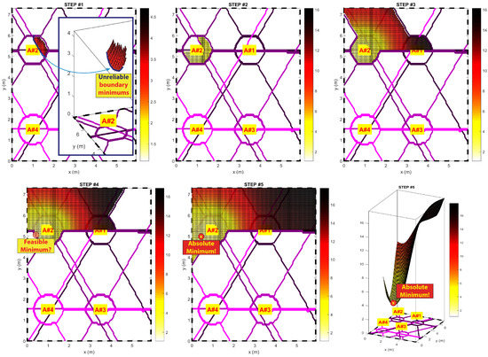 In the subdivided localization spaces of multiple anchors in smaller sub-zones (or cells), each anchor is uniquely linked to a list of corresponding maximal antennas for each anchor plus the absolute maximal antenna (Figure 7). Therefore, every steering vector directly links to a subselection of localization domain (or rather a sub-cell), reducing the computational cost and the maximal localization error.