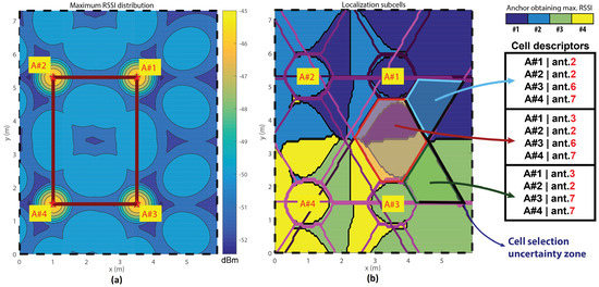 Maximum RSSI distribution over the site (a) and related cell descriptors (b).