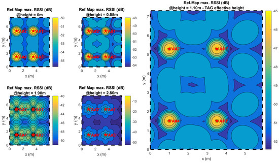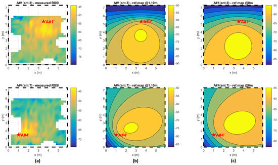 Rather than the measure AWGN, the main source of estimator bias in real applications is the effective inconsistency between the reference map and the effective RSSI distribution over the space. As an example, in Figure 9, the measured RSSI distributions of two different antennas in the experiment site of Figure 1 is shown; next to them, the expected ideal distributions are plotted for two different expected elevations ( = 1.1 m and = 0 m).