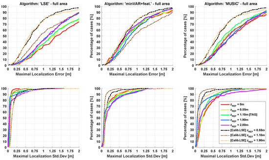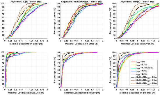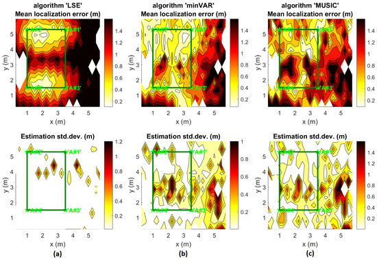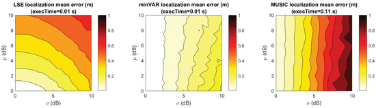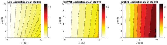 In Equation (13), the minVAR estimator is shown; it evaluates the variance associated with the difference vector built from the measured steering vector and the reference map vector (while the standard least squares estimator calculates its norm using Equation (5)). Assuming a perfect reference map is created, both LSE and minVAR functions act as two unbiased estimators; thus, the CRB of the localization network results, which show the expected accuracy related to typical AWG-noised measures, are the same, as shown in [19].