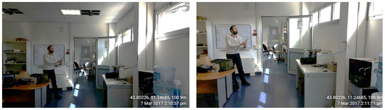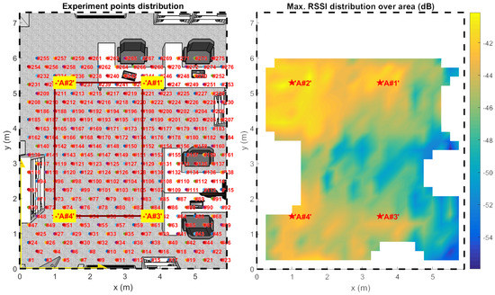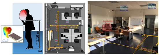 Following a classic fingerprinting approach [10,38], in [19], the concept of predicted fingerprinting is introduced to achieve an acceptable localization accuracy in the site shown in Figure 1. In the predicted fingerprinting reference map, which is compounded by steering vectors collected at each position in classic fingerprinting approaches, the software projects every antenna pattern of each anchor onto the observation floor space. This step was the novelty of [19], as, at the time, there was no need for an extensive offline calibration phase prior to a system’s effective utilization by replacing it with an a posteriori tuning/optimization of antenna projection map parameters [38] respect a small set of training observations.