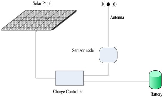 In this paper, we use the most effective and most readily available solar energy harvesting wireless sensor network, with the structure shown in Figure 1, as the energy consumption model [39]. In such a model, a wireless sensor node usually consists of a processor module, a sensor module, a wireless communication module, a solar collector, and a battery [21,22,39], wherein the solar collector is an energy harvesting module, which plays a role of converting light into electrical energy by the photoelectric effect or the photochemical effect. Nowadays, thin film solar cells are used as the mainstream technique to convert light energy into electric energy using the principle of photoelectric conversion, and then stores the electrical energy in the battery [21,22,39]. The battery provides the energy for the energy consumption module of the sensor node. The power controller adjusts the transmission frequency of the wireless communication module according to the energy level of the battery, the sunshine time, the sunshine intensity, the day-night relationship and so on, so as to change the energy consumption condition of the wireless sensor nodes to make maximum use of the limited electric energy.