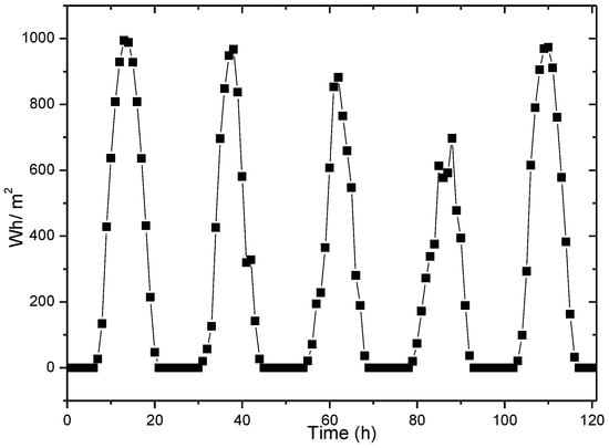 Since the solar energy is affected by the sun, its energy collection is periodic. The data in this paper are based on the radiation at Los Angeles (33° N, 118° W) from 1 August to 5 August 1990, as shown in Figure 2 [39]. It records the light information for every hour in a day. The light information is directly related to the intensity of energy harvesting, which actually reflects the energy harvesting rate.