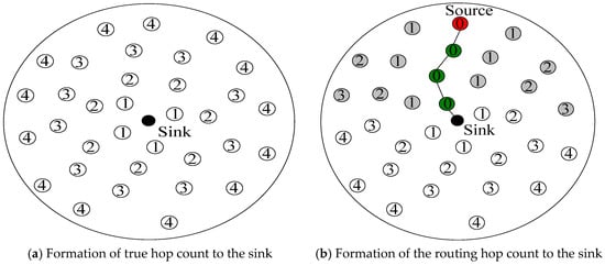The routing hop count to the sink refers to the number of hops with which a node routes the data to sink. In the RBCPSLP scheme, the node uses the shortest path route (SPR) algorithm to route the data to the sink, that is, each node selects the node closest to the sink as the next hop. Although the SPR algorithm is adopted, each node in the RBCPSLP scheme does not choose the true nearest node to the sink as the next hop, but rather selects the routing hop count defined in this paper. The routing hop count of a node to the sink is represented by , and it is determined as in [49].