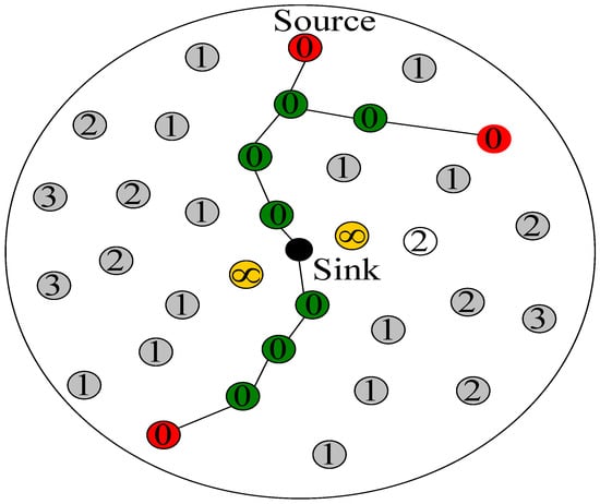 After the hop count of each node to reach the sink is determined, we set the routing hop count of each node to the sink as . In the subsequent routing process, each node selects the shortest routing hop count to route data to the sink. However, unlike previous routing schemes, each node will set its routing hop count to 0 (i.e., ) after it selects its shortest routing path. Then each node updates with a similar approach to obtaining .