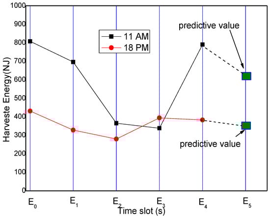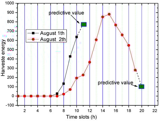In Figure 7, the plot for predictive value just shows the trend of the predicted value of energy, so the predicted value after 11 h is not plotted in the figure. It can be obtained that as time increases, the predicted value increases as well. Therefore, we also use the actual energy harvesting rate of current to predict the energy consumption of remaining period of the cycle. The method used in this paper is the three-point method which predicts energy harvesting rate of the next time slot . Suppose the actual energy harvesting rate of current slot is , and the energy harvesting rates of two recent slots − 1 and − 2 are , respectively. Then we let: