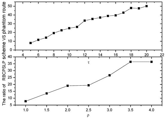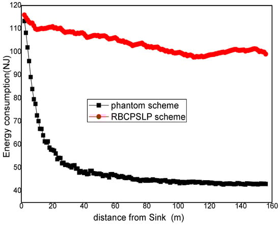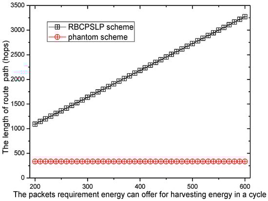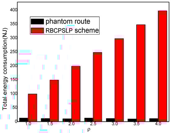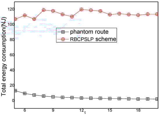 Figure 15 shows the comparison of the total energy consumption between the RBCPSLP scheme and the phantom scheme at different time slot . As can be seen from Figure 15, the total energy consumption in the RBCPSLP scheme is about 10 times greater than that in the phantom scheme. This is because the RBCPSLP scheme creates a number of source nodes, and all the source nodes are split into upside-down tree-like multi-branch routes through the aggregation routing algorithm, thus increasing their total energy consumption several times. However, this have no impact on the network lifetime since this energy belongs to the energy collected in the entire network. In fact, energy consumption is proportional with the length of the routing path, so a high total energy consumption means that the routing path of the RBCPSLP scheme is many times longer than that in the phantom scheme, which also means that the security of the RBCPSLP scheme is higher than that in the phantom scheme. It can also be seen from Figure 14 that in the RBCPSLP scheme, the total energy consumption of the network does not change with the data packet transmission cycle slot . The reason is that the RBCPSLP scheme determines the number of data packets to be sent based on the amount of collected energy. In the case of a fixed number of network nodes, the total energy that the network can collect is also determined, and its total energy consumption basically remains the same. In the phantom scheme, the transmission frequency of the data packet decreases with the increase of the time slot . Therefore, the total energy consumption in the phantom scheme is reduced.