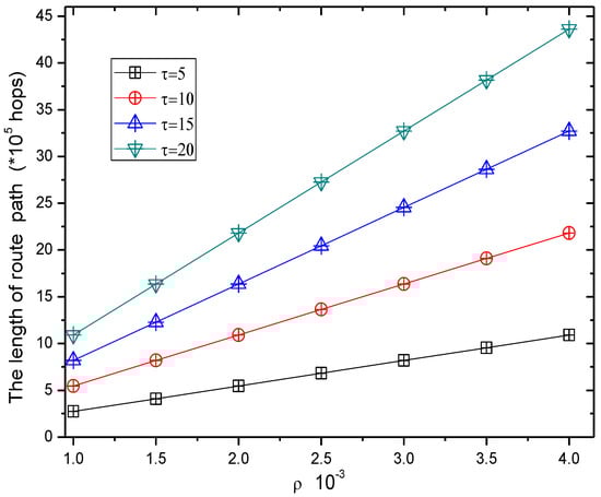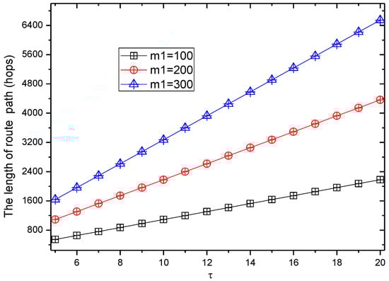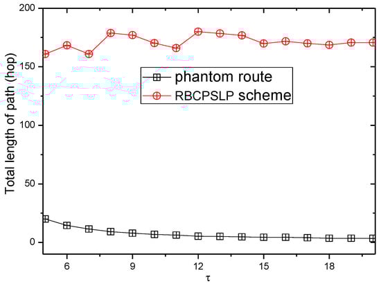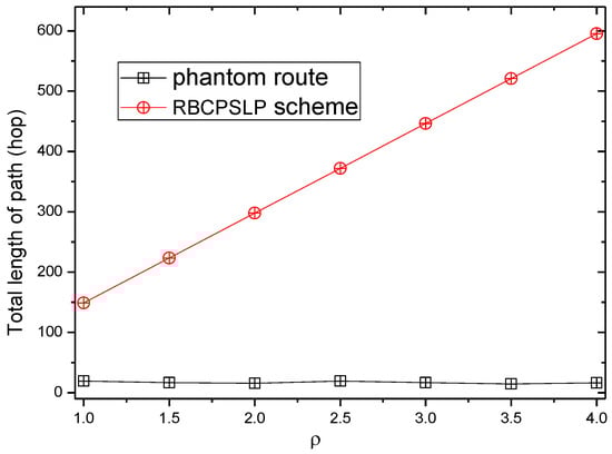 Figure 17 and Figure 18 show the total length of the routing path in the RBCPSLP routing scheme and phantom scheme, and the routing path in the RBCPSLP routing scheme and flooding scheme under different , respectively.