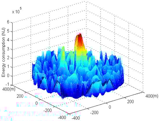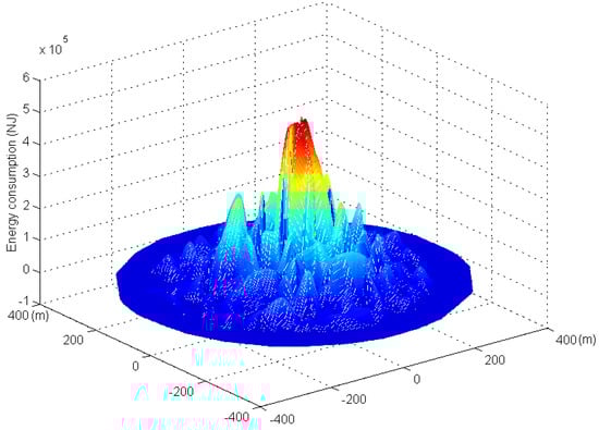 Figure 11 and Figure 12 show the three-dimensional graphs of network energy consumption under the phantom routing scheme and the RBCPSLP scheme, respectively. It can be seen from Figure 11 that the energy consumption in the near sink area is high in the phantom routing scheme, while the energy consumption in the area far away from the sink is low. In the RBCPSLP scheme, due to the full use of the energy collected by the node, the energy consumption in the entire network is relatively balanced when a large of number of source events are created in the non-event area of the network, as shown in Figure 12. Therefore, the RBCPSLP scheme achieves high energy utilization rate by making full use of the network energy.