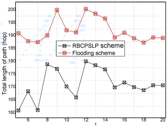 Figure 19 and Figure 20 show the total length of the routing path in the RBCPSLP routing scheme, phantom scheme, and Flooding scheme under different , respectively. As shown from the figures, the security of the flooding scheme is better than that of the other two. This is mainly because the flooding scheme does not take into account the entire network lifetime, and each node sends data to the sink. It can also be observed that although the flooding scheme has good security performance, it may have large energy consumption and low network lifetime. It can be seen from the experimental results that the routing length in the RBCPSLP scheme is 7.8 times longer than that in the phantom scheme. A longer routing length means a stronger security in privacy preserving capability. In the RBCPSLP scheme, a tree-like routing structure is used, in which each branch route in the tree may be a real branch route, or a false interference branch route. However, the adversary cannot distinguish it, so it can only tentatively attack the branch routing using the exhaustive search method. Since the path length is proportional to the security, a long routing path means the high security. The RBCPSLP scheme takes full advantage of the collected network energy, and achieves a total routing length that is 7.8 times the length of the phantom scheme one. Therefore, the RBCPSLP scheme has much higher security than the phantom scheme.