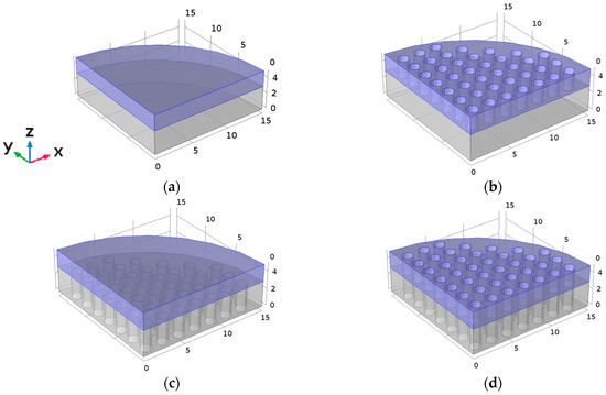 Geometry of the piezoelectric transducer used for the simulations. The scale is in mm; the piezoceramic PZT-4 disc is in blue and the aluminum plate in grey. (a) Model 1 and reference mechanical axis; (b) Model 2; (c) Model 3 and (d) Model 4.