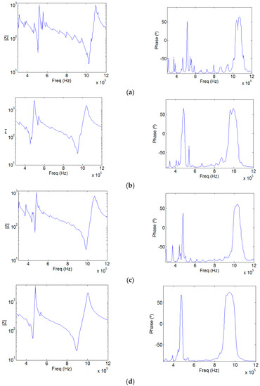 Calculated input electrical impedance. (a) Model 1 impedance module in logarithmic scale and phase. The same for Model 2 (b), Model 3 (c) and Model 4 (d).