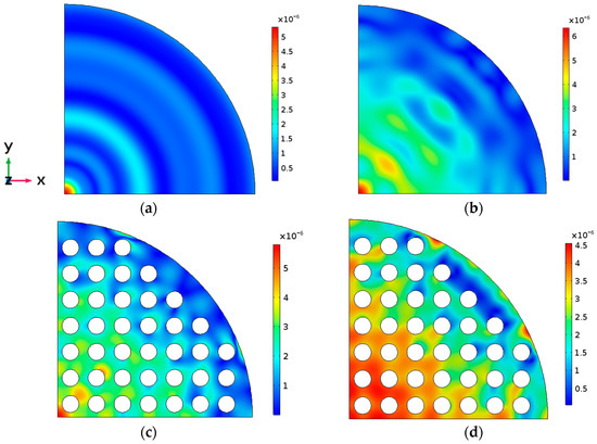 The z direction vibration amplitude calculated at the aluminum surface for the four models at their respective main thickness resonance (one wavelength resonance). (a) Model 1, (b) Model 2, (c) Model 3 and (d) Model 4. The excitation voltage of the piezoceramic disc in all the models was 1V. The bar scale is in mm. The frequency for each model was 997 kHz, 951 kHz, 988 kHz and 894 kHz, respectively.