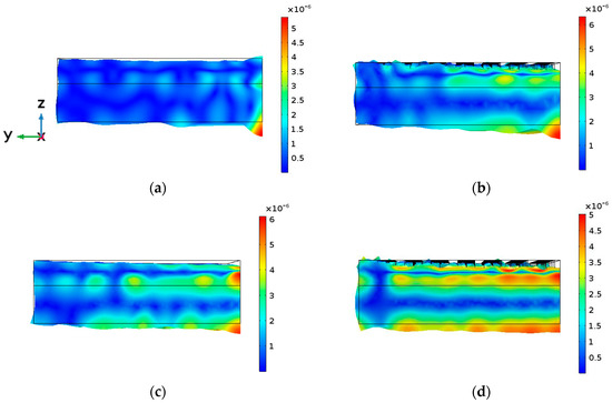 Maximum out-of-plane vibration amplitude at maximum elongation of the aluminum surface in the yz section, x = 0, of the transducer for 1 V excitation of the piezoceramic. (a) Model 1, (b) Model 2, (c) Model 3 and (d) Model 4. The bar scale is in mm. The frequency for each model was 997 kHz, 951 kHz, 988 kHz and 894 kHz, respectively.