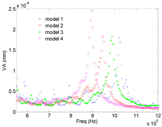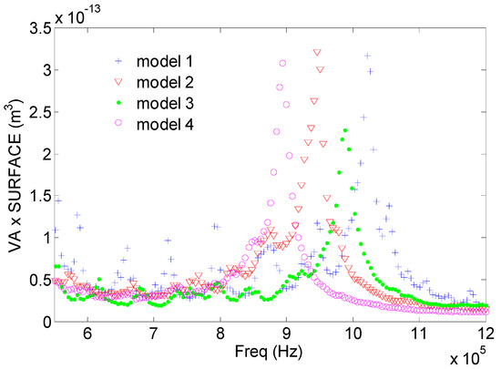 To compare the transduction efficiency of the different models, the average of the maximum value of the vibration along the z axis of all the calculated points in the aluminum face was calculated as a function of the vibration frequency. Figure 6 shows the average, without taking into account the effective radiating surface of each model. As observed, the highest value of each model is attained at the corresponding resonance frequency. The bandwidth is similar. Model 4 displays the highest average mechanical displacement. The softening of the resonance structure is correlated with the increase of the mechanical displacements as expected (see [5]). If the actual emitting surface is considered (Model 3 and Model 4 has a surface with holes), if the average is multiplied by the surface, then these results are modified. From Figure 7 we see that this average amplitude vibration is the same as the obtained from Models 1, 2 and 4. Since Model 4 is the only one with a homogenous phase vibration, we conclude that it is the most efficient.