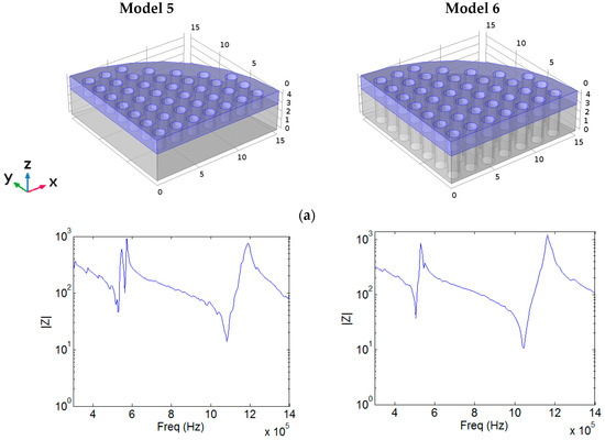 Since the standard lowest frequency used in physiotherapy is 1 MHz, we now consider two more models (Model 5 and 6), similar to Models 2 and 4, but where the piezoceramic disc has 1.5 mm of thickness (Figure 8a). The KLM monodimensional model was used to choose this piezoceramic thickness to get a transducer with a frequency close to the standard 1 MHz.