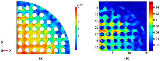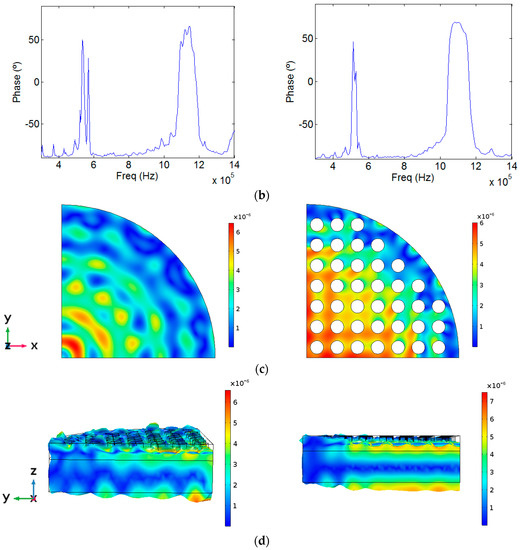 Figure 2b shows the input electrical impedance of Model 2. In this model, only the piezoelectric disc is a phononic structure. As it can be seen, the signature of the radial modes is less evident; the more one approaches the center of the phononic crystal frequency band (1 MHz), the cleaner this signature is. Moreover, as reported in [5], the resonance frequency and the quality factor Q decrease. The mechanical displacement amplitude pattern of the aluminum surface at the resonance frequency (951 kHz) is shown in Figure 3b and Figure 4b. It is evident that the influence of the radial modes is lower than in the case of the device without phononic crystal. The out-of-plane vibration still has radial symmetry, but it is less concentrated and in-phase (Figure 3b). The phononic crystal structure of the piezoceramic was capable of improving the phase vibration, even at the aluminum transducer surface.