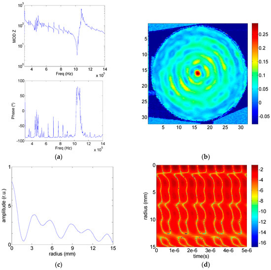 Experimental results for Model 3, (a) Module and phase of the electrical impedance; (b) Aluminum surface out-of plane mechanical displacement in linear arbitrary units; (c) Mechanical maximum displacement amplitude along the radius; (d) Relative mechanical displacement amplitude as a function of time along the radius in logarithmic scale.