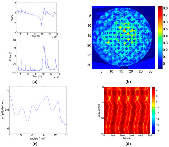 Models 1 was first tested to compare with the numerical results. Figure 9 shows the set of electrical and mechanical outputs of Model 1. Figure 9a shows the electrical impedance module and phase and Figure 9b shows the aluminum surface out-of-plane mechanical displacement measured by laser vibrometry in linear arbitrary units. Figure 9c shows the maximum amplitude of the mechanical displacement along the radius.