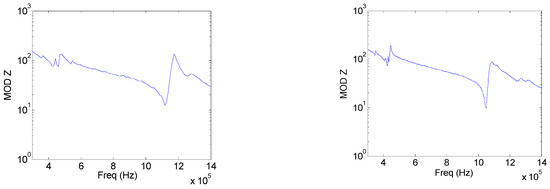 Experimental measurements of the input electrical impedance were carried out with a 4294A Impedance Analyzer (Agilent, Santa Clara, CA, USA) and the out-of-plane mechanical amplitudes were recorded using laser vibrometry. The vibrometry experimental setup consisted of an OFV 50000 single-point vibrometer (Polytec, Waldwronn, Germany) with VD06 and DD900 decoders with a OFV 505 head, a set of UT 100-75 linear stages (Micro-Controle, Newport Co., Irvine, CA, USA) with a Micro-Controler TL78 main frame, a 3000 Wave Surfer oscilloscope (Teledyne LeCroy, Heidelberg, Germany,) and homemade software to control the stages and the signal acquisition.