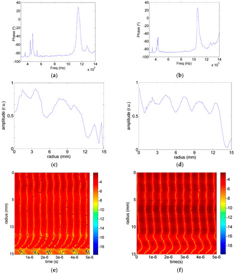Experimental tests of Models 5 and 6; (a) Module and phase of the electrical impedance of Model 5; (b) Module and phase of the electrical impedance of Model 6; (c) Amplitude of the mechanical displacement along the radius of Model 5; (d) Amplitudeof the mechanical displacement along the radius of Model 6; (e) Relative mechanical displacement amplitude as a function of time, also along the radius (logarithmic scale) in Model 5; and (f) Relative mechanical displacement amplitude as a function of time, also along the radius (logarithmic scale) in Model 6.